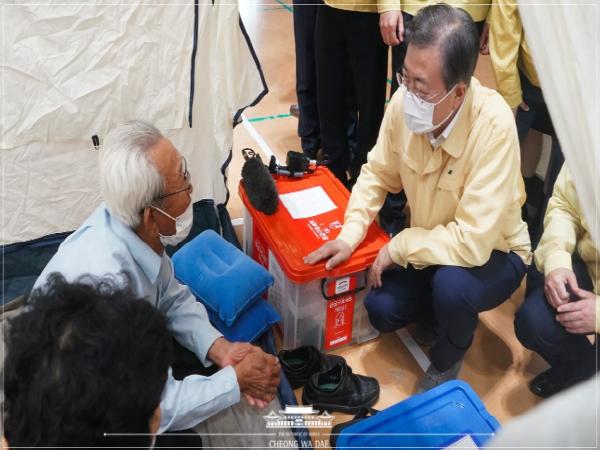 한 이재민은 "80년 동안 농사 짓고, 비도 많이 왔지만 이렇게 정부에서 나선 적은 처음"이라고 말했다. 이에 문재인 대통령이 "그래도 불편한 것이 있으면 말씀을 해 달라"고 요청하자 "여기 전부 나이가 70대 이상이니 웬만하면 빨리 집으로 보내주면 좋겠다"고 답했다.