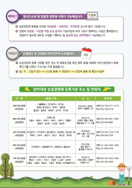 임야대상 농업경영체 등록에 따른 혜택으로는 ▲면세유 구입 ▲농자재 구입 시 영세율 적용 ▲각종 보조·융자금 지원사업 지원 시 자격증명 대체(간소화) 등이 있다.