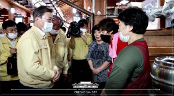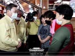 문재인 대통령은 자원봉자들과 악수를 나누며 "자원봉사를 해 주시니 희망과 격려가 된다"며 감사인사를 전하기도 했으며, 한 상인이 "상인들이 잠을 못잔다"고 말하자, 손을 잡으며 위로를 하기도 했다.