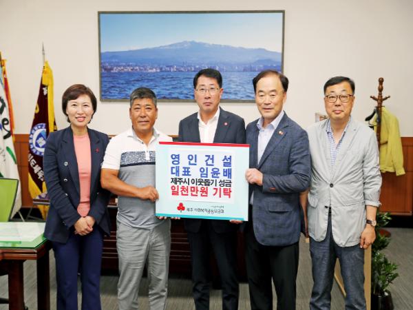 ㈜영인건설(대표 임윤배)에서는 8월 13일 안동우 제주시장을 찾아 “코로나 19로 어려움을 겪고 있는 지역사회 취약계층에 도움을 드리고 싶다”며 1,000만원의 성금을 제주시에 기탁하였다.