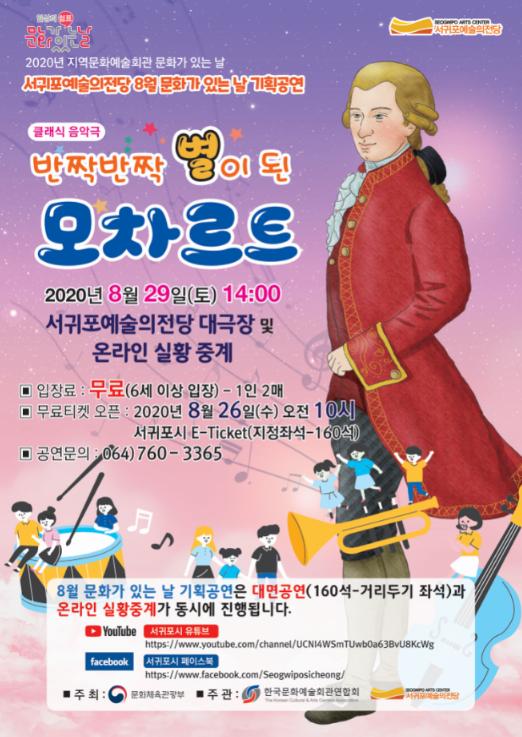 서귀포예술의전당은 8월 문화가 있는 날 기획공연 ‘반짝반짝 별이 된 모차르트’클래식 음악극을 오는 29일 오후 2시에 온라인 생중계한다고 밝혔다.