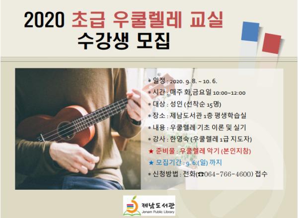 제남도서관(관장 황정식)에서는 우쿨렐레 초급 교육을 통하여 지역주민으로 하여금 음악에 대한 흥미를 높이고자 2020 (초급)우쿨렐레 교실의 수강생을 모집한다.