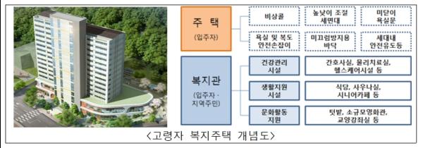 2015년부터 2017년까지는 정부재정과 민간 사회공헌기금을 활용해 고령자용 영구임대주택인 공공실버주택사업을 추진하였으며, 올해부터는 "주거복지 로드맵"에 따라 ‘고령자복지주택’ 공급 확대를 위해 정부가 사회복지시설 건설비용의 일부를 지원해 추진하고, 지자체 등이 희망하는 경우 고령자용 영구임대주택과 함께 국민임대·행복주택도 함께 공급할 수 있도록 할 계획이다.