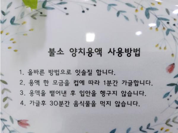 불소양치용액의 올바른 사용법은 칫솔질을 한 후 약 10cc(한모금)를 입에 물고 1분간 가글하고 뱉어 낸 후 30분간 물이나 음식을 먹지 말아야 한다.