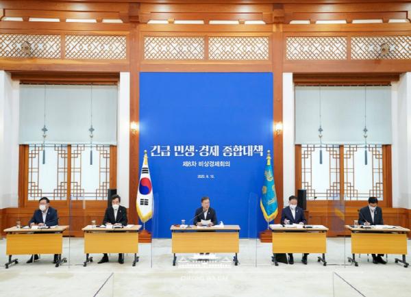 문재인 대통령은 "코로나 재확산으로 인해 심각한 경제적 어려움에 처한 국민들의 삶을 지켜내기 위해 8차 비상경제회의를 열게 되었다"며 회의 개최의 의미를 설명했다.