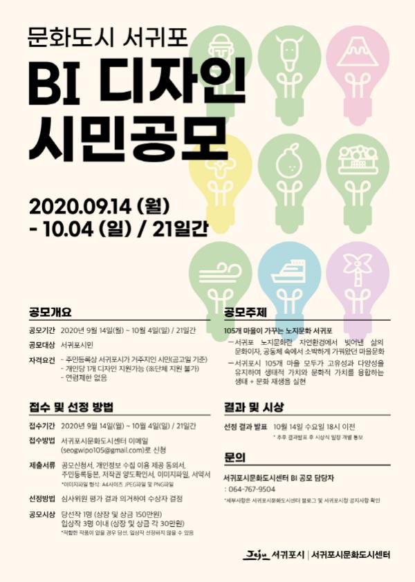 서귀포시문화도시센터에서는 ‘105개 마을이 가꾸는 노지문화 서귀포’라는 비전을 갖고 미래세대를 위한 생태문화X문화생태 도시 이미지 구축을 위해 9월 14일부터 10월 4일까지 BI 디자인을 공모 접수 받는다.