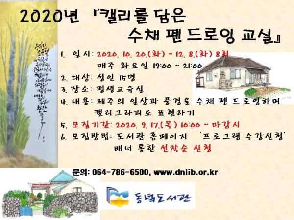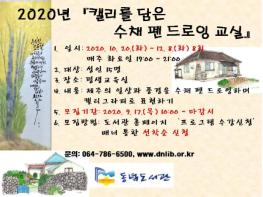 동녘도서관(관장 현관주)은 학부모 및 지역주민의 건전한 여가시간 활용 및 자기계발 기회를 마련하고자 ?년 켈리를 담은 수채 펜 드로잉 교실’참가자를 모집한다.