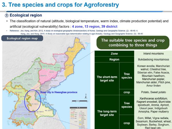 국립산림과학원 양아람 박사는 ‘북한의 지형환경과 생태특성을 고려한 임농복합경영 연구’를 주제로 발표를 진행하였으며, ICRAF 지안추 수(Jianchu Xu) 박사는 ‘북한의 임농복합경영 연구(Agroforestry Research in DPRK)’를 주제로 발표하였다.