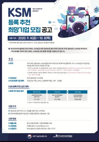 한국인터넷진흥원(KISA, 원장 김석환)은 과학기술정보통신부(장관 최기영)와 정보보호 기업의 지속적인 성장 및 투자유치 기반을 확보하기 위해 '한국거래소 스타트업 마켓(KSM, KRX Startup Market) 등록 희망 기업'을 모집한다고 9. 14일 밝혔다.