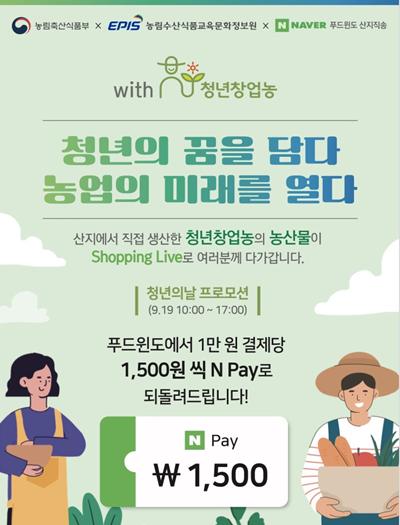 청년 농업인 대상 사전 입점 교육 및 판매 수수료(2~3%) 면제 등을 지원하고, 네이버 푸드윈도 산지직송 코너 내 기획페이지를 개설하여, 1만원 구매 당 1,500원의 Npay를 돌려주는 프로모션을 추진하고(9.18~), 청년의 날(9.19, 토)에는 청년 농업인 특집으로 10시부터 17시까지 전국 각지(전남 보성, 경기 양평, 경북 영주 등)의 6개 청년 농가에서 쇼핑 라이브를 진행하고, 방송 중 구매 고객에게는 Npay 지급과 함께 추가할인 및 사은품 증정 등의 혜택을 제공한다.