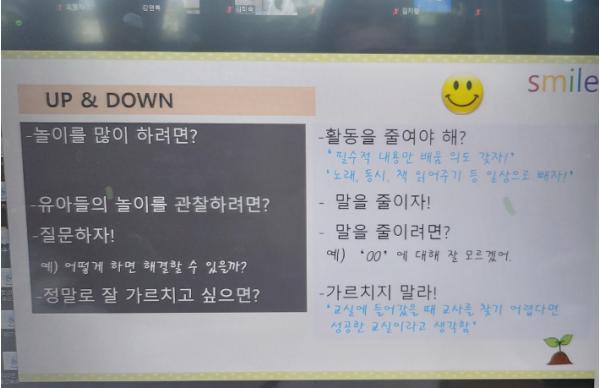 소규모 집합연수로 계획하였던 이번 연수는 코로나19 대응 및 확산방지를 위해 화상연수로 전환하여 운영하였다. 교육부 요청 도지정 2019개정누리과정 시범유치원 교사를 초빙하여 새로운 교육과정 적용에 있어서 교사의 고민과 철학, 유치원에서의 활동 사진 및 동영상 공유를 통해 교사 중심이 아닌 유아?놀이중심의 교육과정 운영으로 유아교육의 본질을 찾아가는 모습을 확인할 수 있었다.