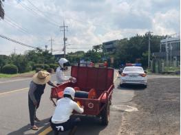 가을 수확철 시외권에서 경운기 사고가 연이어 발생함에 따라 매일 교통싸이카팀이 시외권 2~3개 마을을 순회하며 경운기의 시인성 확보와 일주도로 저속운행에 대한 안전 확보를 위해 경운기에 반사지를 부착한다.