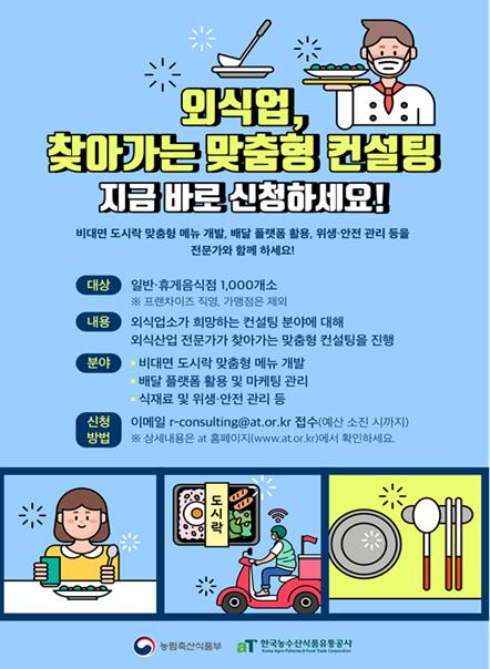 농식품부에서 선정한 외식분야 컨설팅 전문기관이 외식업소를 직접 방문하여 일반 운영관리(위생·식재료·마케팅 등)와 코로나19 대응을 위한 비대면 메뉴 개발 등의 컨설팅을 지원한다.