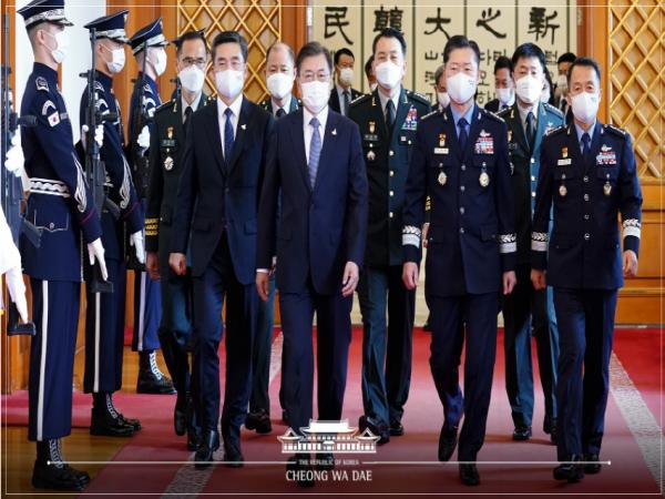 이후 이어진 환담에서 문재인 대통령은 "군의 가장 기본적인 사명은 강한 국방을 갖추는 것"이라며 "강한 국방력의 목표는, 전쟁의 시기는 당연히 이기는 것이고, 평화의 시기는 평화를 지켜내고 평화를 더 발전시키는 것"이라고 말했다.