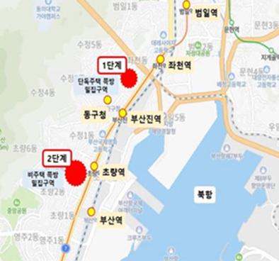 부산시와 동구청은 주거여건이 매우 열악하고 정비가 시급한 좌천역 주변을 1단계로 정비하고, 여관·고시원 등 비주택 거주자가 많은 초량역 주변은 향후 2단계로 정비를 추진할 계획이다.