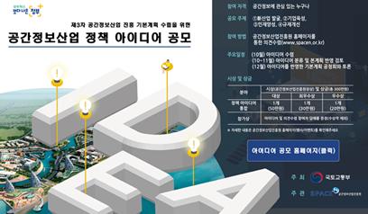 국토교통부는 올해말 수립할 예정인 “제3차 공간정보산업 진흥 기본계획”에 담을 정책 아이디어를 9월 30일부터 10월 31일까지 공모한다고 밝혔다.
