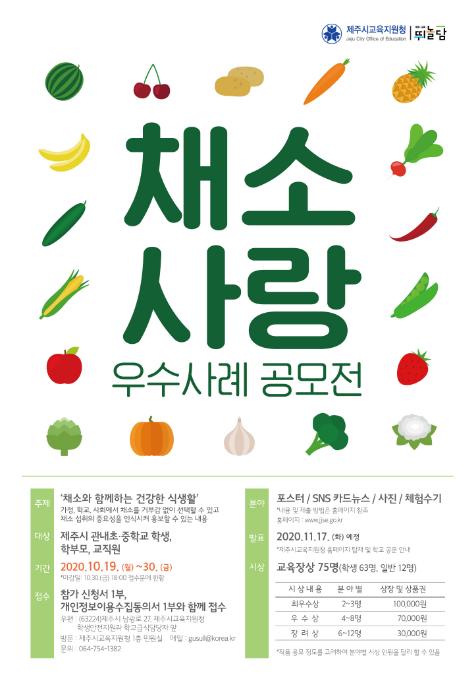 제주시교육지원청은 오는 10월 19일(월)부터 10월 30일(금)까지 제주시 관내 초·중학교 학생, 학부모, 교직원을 대상으로‘채소사랑 우수사례 공모전’을 개최한다고 밝혔다.