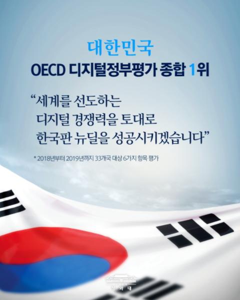 청와대 강민석 대변인은 16일 브리핑을 통해 "한국이 OECD 디지털정부 평가에서 총 33개의 나라 중 1위를 차지했다"고 밝혔다. 아울러 "2위에서 5위까지는 영국, 콜롬비아, 덴마크, 일본 순"이며 "여러 가지로 의미 있는 결과라고 생각한다"고 말했다.
