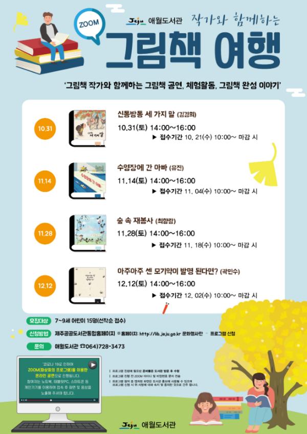 제주시 애월도서관에서는 어린이들을 위해 비대면 프로그램 『작가와 함께하는 그림책 여행』을 운영한다.