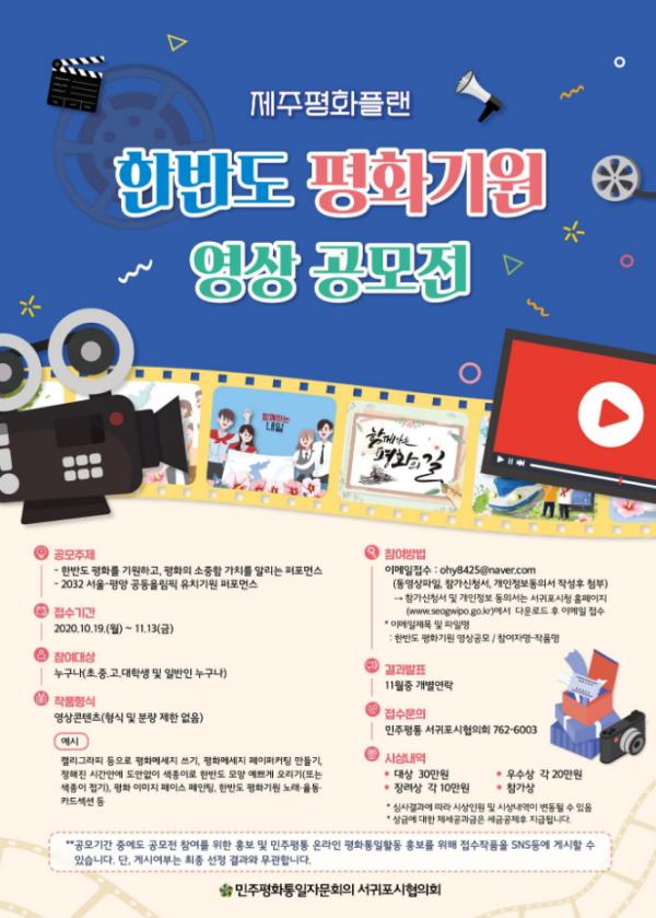 민주평화통일자문회의서귀포시협의회는 한반도의 평화를 기원하고 2032년 서울-평양 공동올림픽 유치를 기원하고자 한반도 평화기원 영상공모전을 10월 19일부터 11월 13일까지 시민을 대상으로 공모한다.