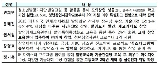 일례로 , ‘발명·특허 특성화고등학교’에 진학해 체계적인 발명교육을 받은 연희연 학생은 직접 개발한 발명교구의 특허등록을 통해 본격 창업을 시작했고, 이후 특기자 전형으로 서강대학교에 진학했다.