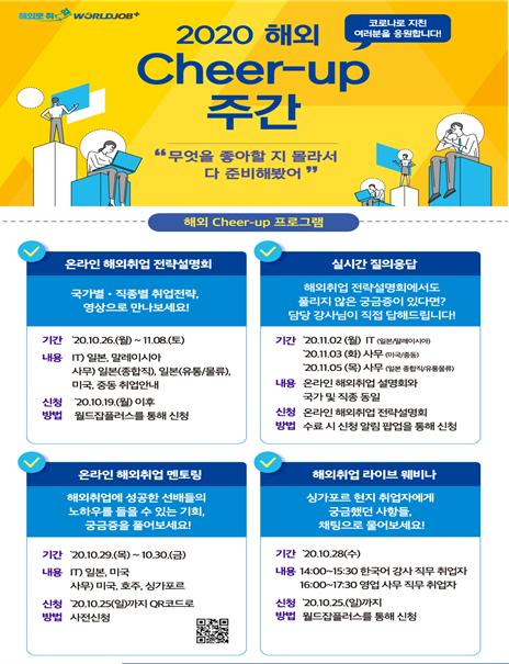 고용노동부가 주최하고 한국산업인력공단(이사장 김동만)이 주관하는 ‘2020 해외 Cheer-up 주간’이 10월 26일부터 11월 8일까지 14일간 월드잡플러스(www.worldjob.or.kr)를 통해 온라인으로 개최된다.