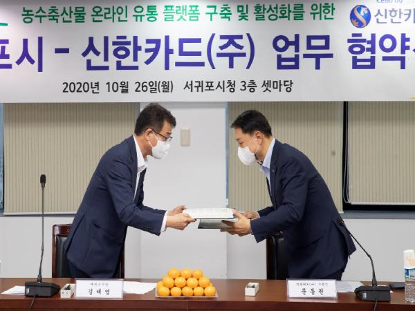 서귀포시는 내년도 역점사업으로 계획하고 있는 농수축산물 온라인 유통 플랫폼 구축사업을 활성화하기 위해 지난 26일 신한카드와 업무협약을 체결하였다고 밝혔다.
