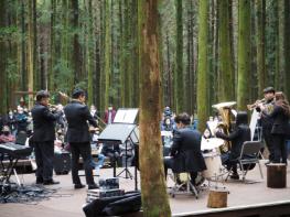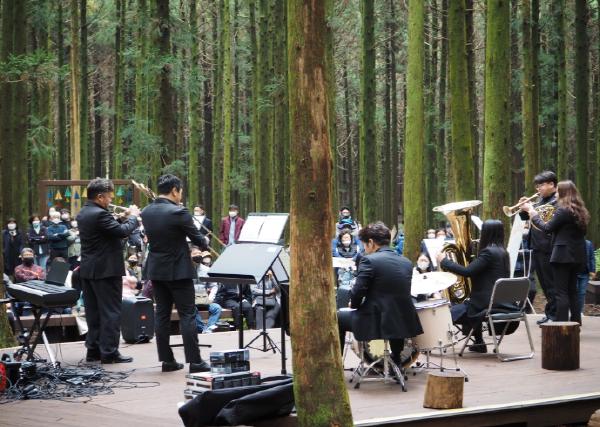 먼저 22일 14시 사려니 숲길에서는 “무곡”, “마중”, “오래된 노래”, “청산에 살리라”등 제주도립 서귀포합창단 단원들의 솔로 곡 4곡과 단체 곡 “10월의 어느 멋진 날”로 공연의 문을 열었다. 이후, 제주도립 서귀포관악단의 목관 4중주 앙상블이 선보이는 “디즈니 알라딘 메들리”와 헨델의 “Arrival of Queen of Sheba”, 금관 5중주가 연주하는 크리스마스 테마곡 “All I want for Christmas is you”, 퀸의“Don’t Stop me now”등을 통해 관객들과 호흡했다.