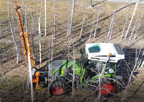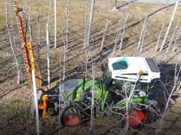 과수원 기계화는 트랙터에 가지치기(전정)와 꽃솎기(적화) 기계 장치를 부착해 앞으로 이동하면서 작업을 수행하는 방식이다.