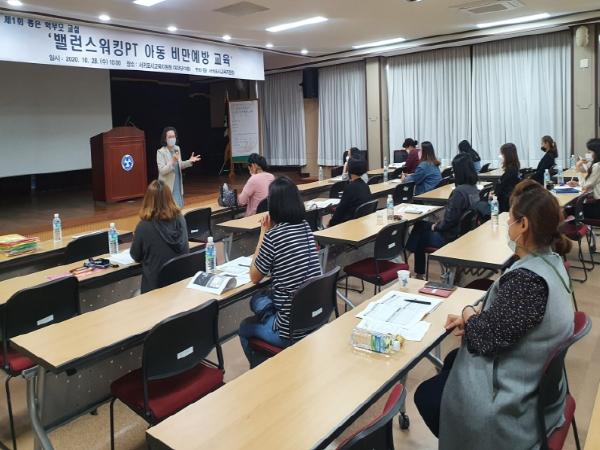 곽승환 강사(밸런스워킹PT 교육연구소 교육팀장)의 ‘밸런스워킹 PT 아동 비만예방’을 주제로 관내 초, 중학교 학부모를 대상으로 실시하였다. 아동 비만의 원인을 알아보고 밸런스워킹을 익혀 자녀의 비만 예방 지도를 할 수 있도록 하는데 중점을 두고 강의를 펼쳤으며, 자녀의 건강한 활동을 위해 부모가 함께하며 아이들의 마음을 읽고 자녀와 더 가까워질 수 있도록 도와줌으로써 부모의 자녀 양육에 자신감을 향상시킬 수 있도록 교육을 진행하였다.