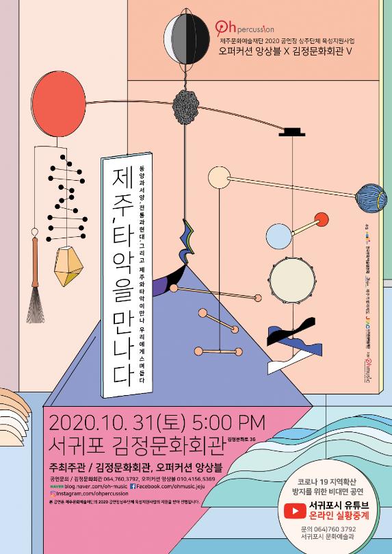 서귀포시 김정문화회관은 2020년 공연장상주단체육성지원사업을 통해 함께 사업하고 있는 오퍼커션 앙상블의 두 번째 기획 공연 <제주, 타악을 만나다>를 오는 10월 31일 토요일 오후 5시에 코로나 지역 확산 방지를 위하여 유튜브(채널 서귀포)를 통해 비대면 온라인 공연으로 진행할 예정이다.