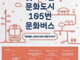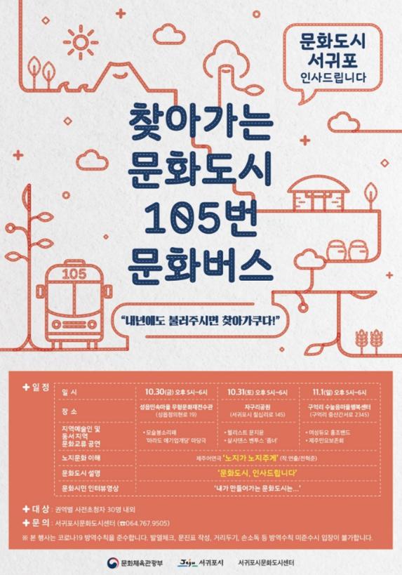 찾아가는 문화도시 105번 문화버스는 10월 30일(금) 성읍민속마을 내 무형문화재전수관, 10월 31일(토) 서귀포 자구리공원, 11월 1일(일) 대정읍 구억리 수눌음마을 행복센터에서 각 오후 5시에 진행된다. 코로나19 방역수칙으로 인해 각 마을이장 및 사무장, 마을 관계자들 포함 권역별 30명 내외로 사전초청자에 한해서 행사가 진행된다.