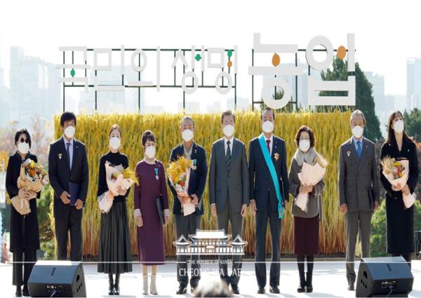문재인 대통령은 농업인의 날을 맞아 선정된 우리나라 농업·농촌 발전에 기여한 유공자 157명 중 5명에게 정부포상을 직접 수여했다.