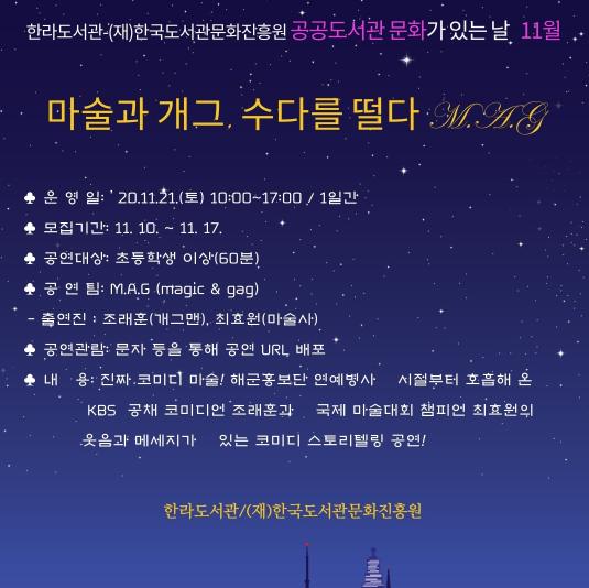 한라도서관이 오는 11월 21일과 28일 2회에 걸쳐 가족단위 공연을 온라인으로 개최한다.