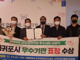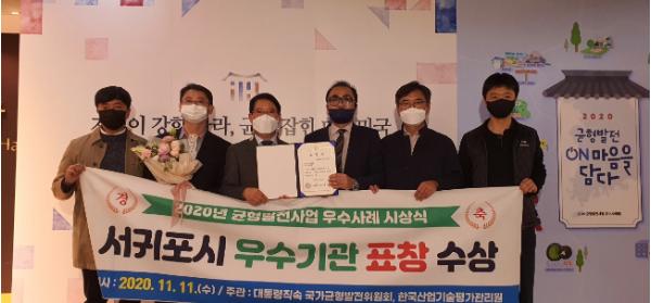 서귀포시는 지난 11일 그랜드플라자청주호텔에서 대통령 직속 국가균형발전위원회 주관으로 열린 「2020년 균형발전사업 우수사례 시상식」에서 ‘우수기관’표창을 수상하였으며, 이와 더불어 담당 공무원(마을발전팀장 임정순) 및 민간 유공자(전 덕수리장 송승민)표창을 함께 수상하는 영광을 안았다고 밝혔다.
