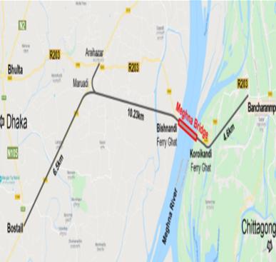 메그나 대교는 방글라데시 수도 다카의 메그나 강을 연결하는 총 24Km 연장의 교량 사업(인접 도로 약 21km 포함)으로 한국 해외 인프라도시개발지원공사(이하 KIND)와 우리 컨소시엄(대우건설, 현대건설, 한국도로공사)이 우선사업권을 바탕으로 타당성조사 및 사업 개발을 추진할 계획이다.