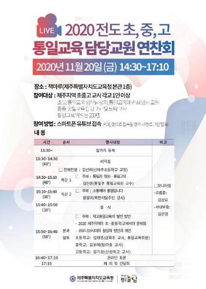 온라인 토론회는 오는 11월 20일(금) 오후 2시 30분부터 ‘제주 초?중?고 통일교육 담당교원 연찬회’를 도교육청 1층 책마루에서 개최한다. 연찬회는 제주도교육청 유튜브에서 생중계한다.