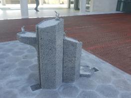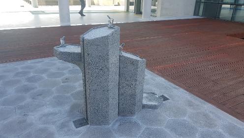 음수대는 제주지역에서는 염분이 많은 바람이 부는 만큼 해안바람으로 인해 도장이 벗겨지지 않도록 현무암을 이용한 디자인이 특색이다.