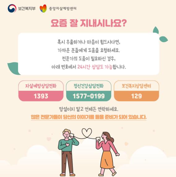 오대영 서귀포시정신건강복지센터장(정신과전문의)은 “자살 등 정신건강문제는 단순한 정신과적 문제를 넘어서 사회구조적인 문제이자 우리 사회 모두가 함께 해결해야 할 문제”라며 “코로나19의 장기화로 자살위험 증가가 우려되는 상황에서 내 주변의 소중한 생명을 지키는 첫걸음은 가까운 가족, 동료에게 먼저 다가가 관심 갖고 자살위험신호를 발견했을 때 상담전화(1393)로 전화하거나 보건소 정신건강복지센터에서 상담할 것”을 당부하였다.