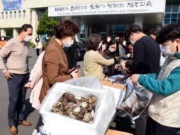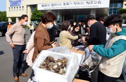 아울러, 도교육청은 지난 10월 27일(화) 서귀포수협과 함께 코로나19로 수출판로가 막힌 제주뿔소라 소비촉진을 위하여 공직자 중심으로 공동구매행사를 전개하였으며, 학교급식에 제주뿔소라를 적극 반영할 수 있도록 다양한 레시피도 제공하였다.