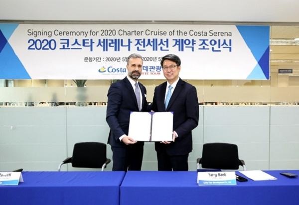 체결식은 임원 및 관계자들이 참석한 가운데 이루어 졌으며 이번 체결을 통해 롯데관광은 2020년 코스타 세레나호 총 2항차 전세선을 운영한다.