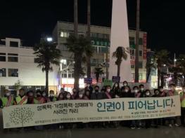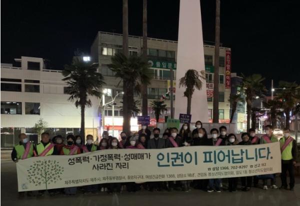 제주시(여성가족과)는 일도1동청소년지도협의회(회장 고기현), 건입동청소년지도협의회(회장 이정선), 성매매피해자 지원시설인 제주현장상담센터“해냄”, 여성긴급전화 1366 및 시?도 관계공무원 등 30여명이 참여한 가운데 11.25(수) 20:00부터 산지천 일대에서 성매매 근절을 위한 민·관 합동캠페인을 전개했다.
