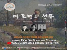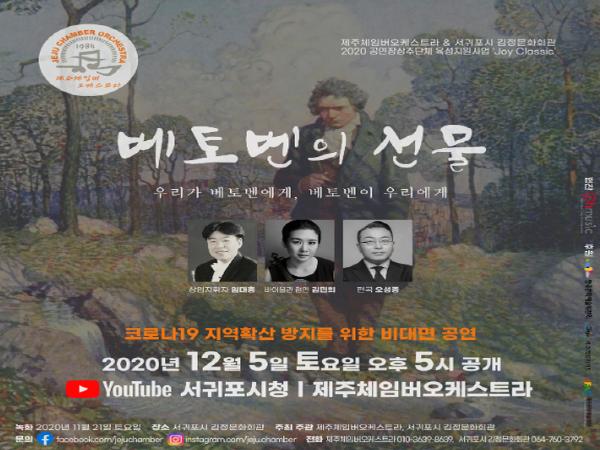 서귀포시 김정문화회관과 공연장상주단체육성지원사업을 통해 3년 간 사업하고 운영하고 있는 “제주체임버오케스트라”의 두번째 공연 <베토벤의 선물>이 지난 11월 21일 비대면 녹화 공연으로 진행하고 코로나로 인하여 문화예술 향유의 기회가 적어진 지역민들을 위해 오는 12월 5일 토요일 오후 5시에 유튜브(채널 서귀포)를 통하여 녹화분이 공개된다.