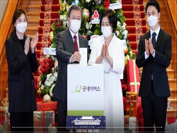 문재인 대통령과 김정숙 여사는 기부와 나눔문화 확산을 기원하며 각 단체별 모금함에 성금을 기부한 뒤 단체 관계자 및 홍보대사와 기념촬영을 했다.
