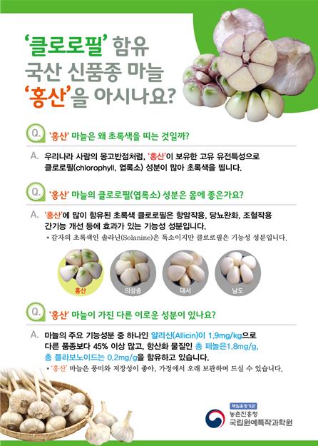 넓을 ‘홍(弘)’, 마늘 ‘산(蒜)’의 이름 뜻처럼 따뜻한 곳(난지형)과 추운 곳(한지형) 전국 어디서나 재배할 수 있는 마늘로, 수입 씨마늘 대체 품종으로 주목을 받아왔다.