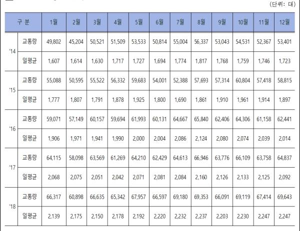 월간 최대 교통량은 12월에 7만 대를 기록했으며, 하루 최대 교통량은 12월 21일 2,391대로 조사됐다.