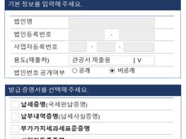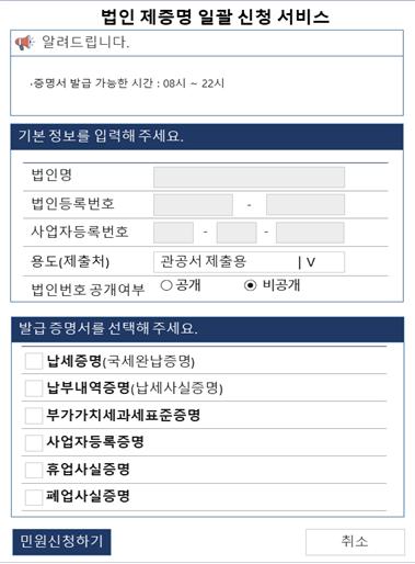 이번에 제공하는 “법인 제증명 일괄신청 서비스”는 법인의 .국세 관련 민원사무를 한곳에 모아서 보여주고 간단한 입력만으로 필요한 증명서를 한 번에 신청하고 발급받을 수 있는 서비스이다.
