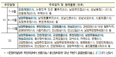오는 7월 인천계양을 시작으로, 7~8월 중에는 남양주 진접2, 성남, 의왕, 서울도심의 노량진 수방사부지 등에 대해 사전청약이 시행되고, 9~10월 중에는 남양주왕숙2를 포함하여 성남, 시흥 등에서 사전청약이 시행될 예정이다.