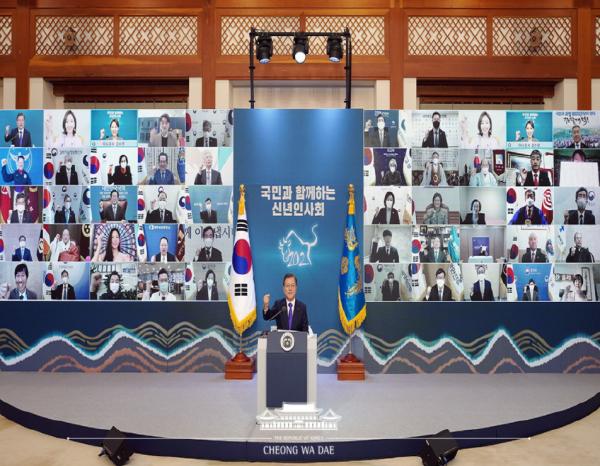 문재인 대통령은 “화상으로 열린 신년인사회에 참석하셔서 어려움을 겪고 있는 국민들에게 따뜻한 말씀을 해 주셔서 감사하다”는 인사말로 마무리 말씀을 하셨다.