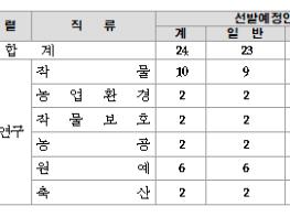 채용예정 직급은 농업연구사이며, 작물, 농업환경, 작물보호, 농공, 원예, 축산 등 6개 직류별로 모집한다.